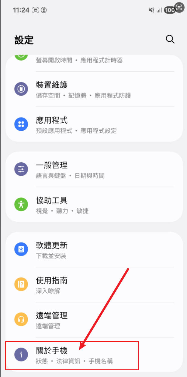 在設定選單中,向下捲動找到並點擊 “關於手機” 或