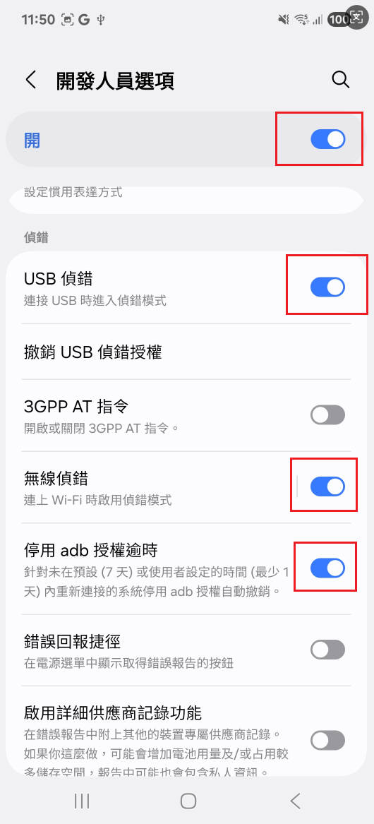 (Android 11+)啟用「停用 ADB 授權逾時」選項。